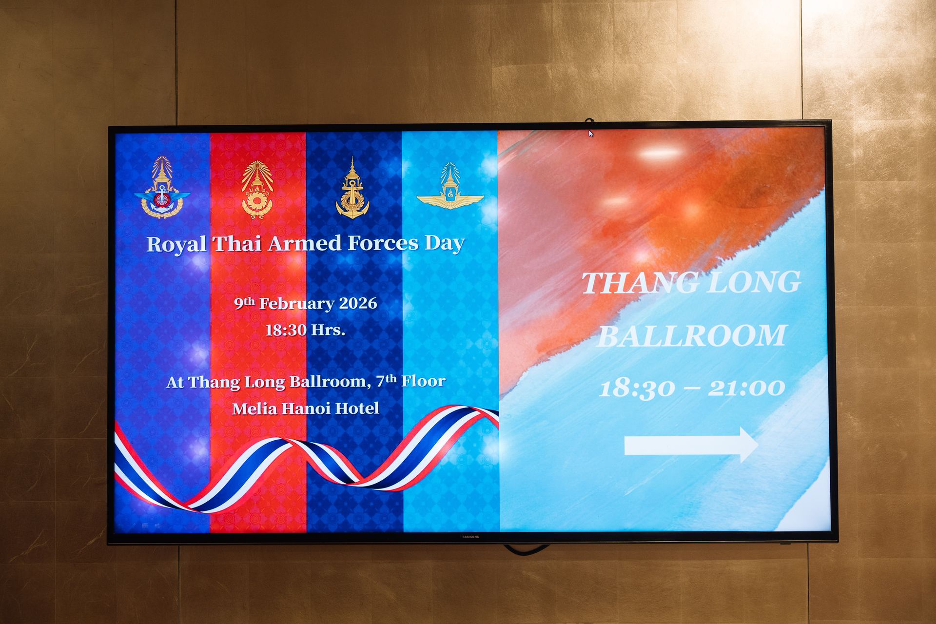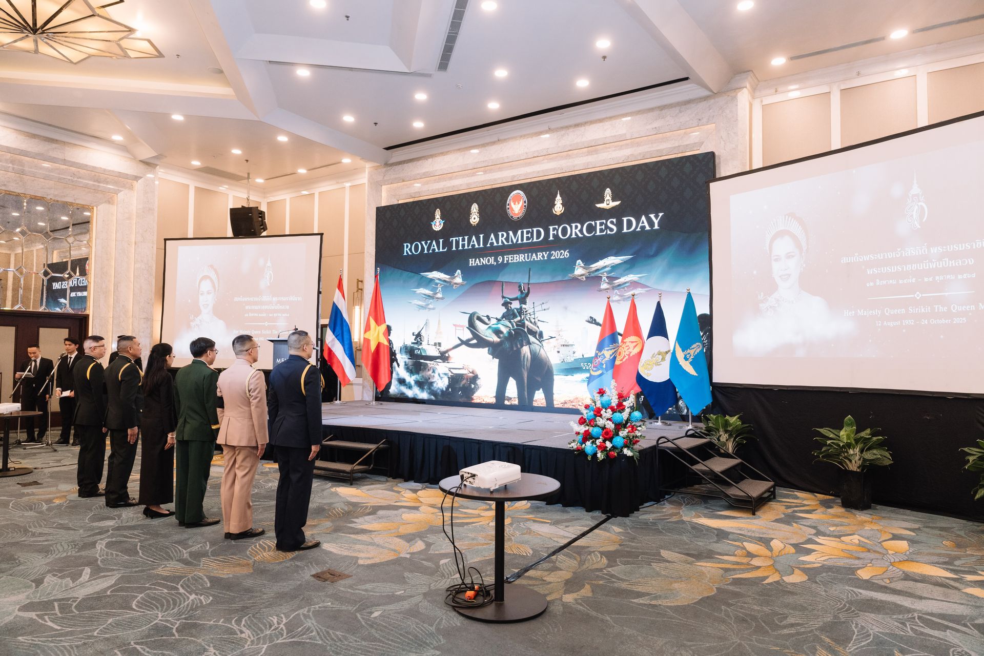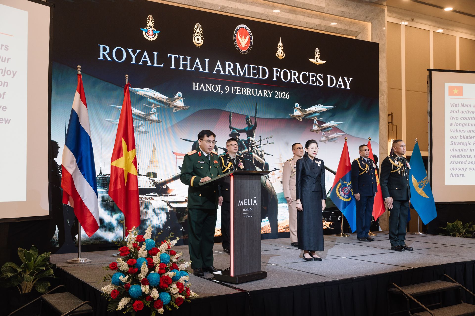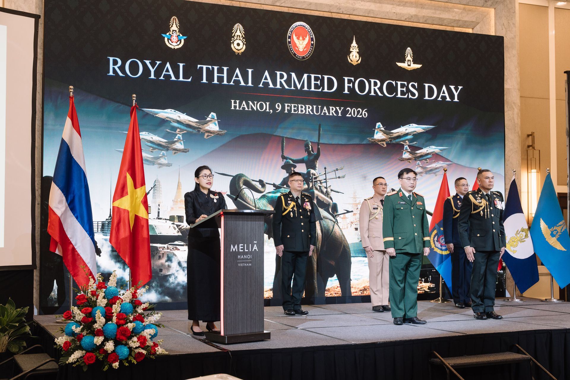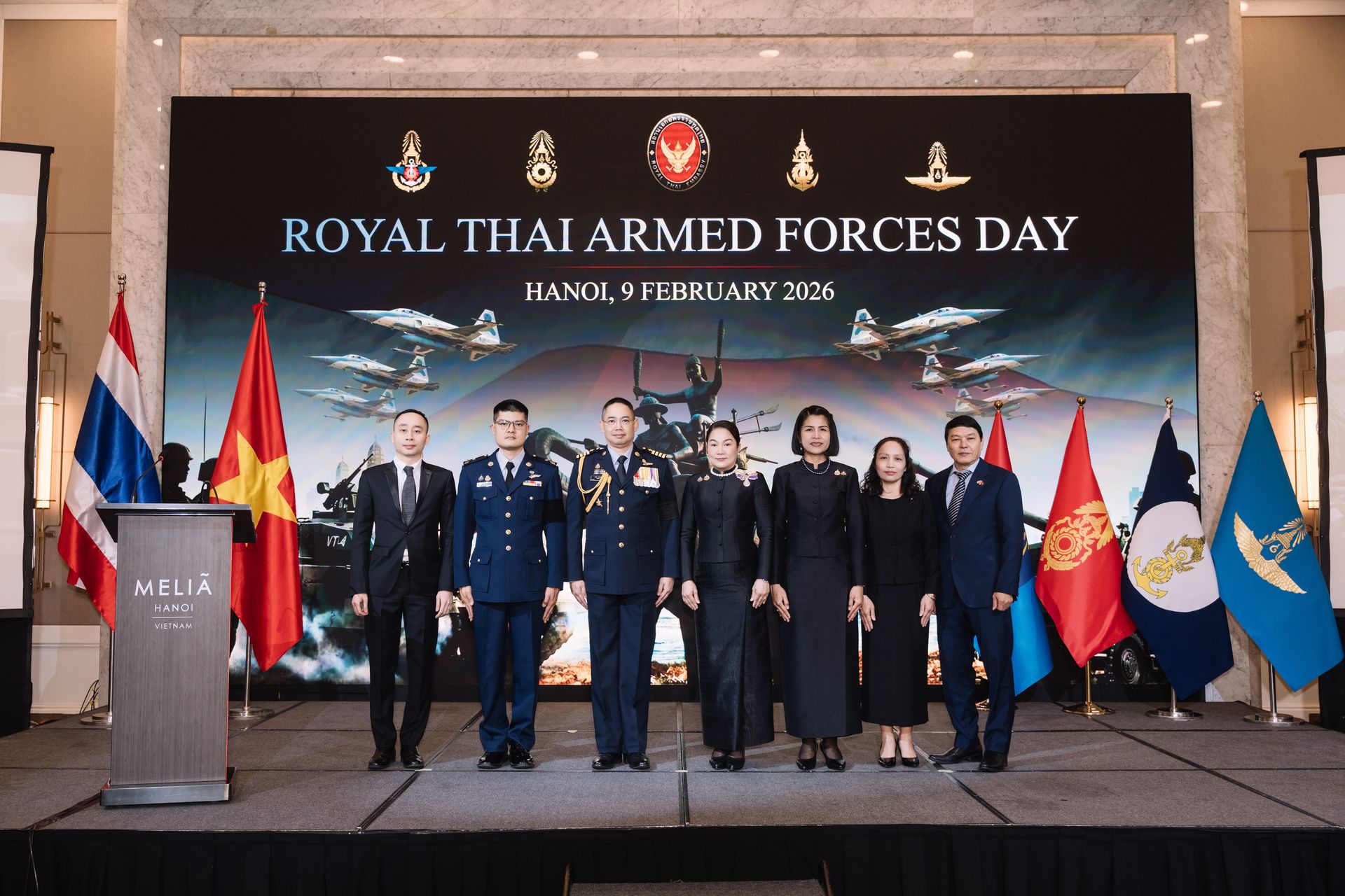 เมื่อ ๙ ก.พ.๖๙ เวลา ๑๘๐๐ ผชท.ทหาร ๓ เหล่าทัพ ไทย/ฮานอย พร้อมด้วยภริยา, ขรก.และ ลูกจ้าง สน.ฯ ได้ร่วมกันเป็นเจ้าภาพงานเลี้ยงรับรองเนื่องในโอกาสวันกองทัพไทย ประจำปี ๒๕๖๙ ณ ห้อง Thang Long โรงแรม Melia Hanoi โดยมีนางสาวอุรวดี ศรีภิรมย์ เอกอัครราชทูต ณ กรุงฮานอย เป็นประธาน